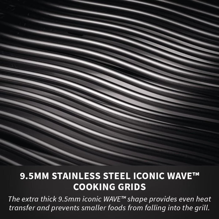 9 mm stainless steel WAVE™ cooking grids deliver even heat distribution and patented sear marks